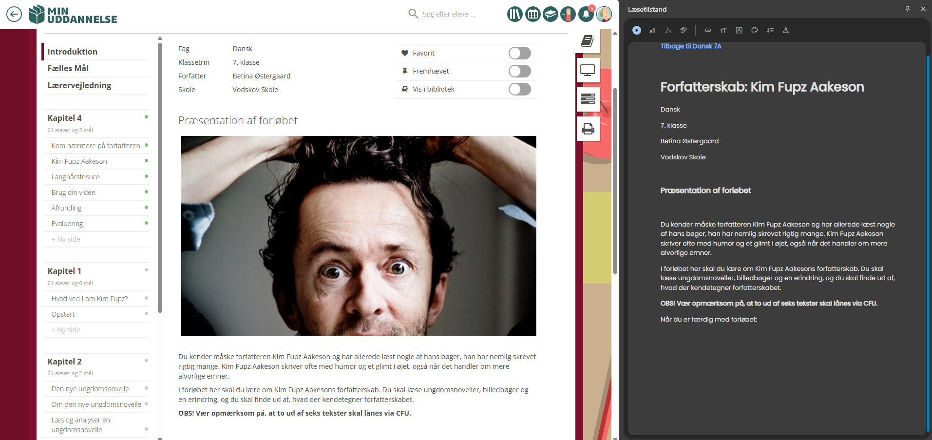 Med den nye læsetilstand fremhæves ordene, så eleverne let kan følge med. Oplæsning fungerer også på PDF-filer, og eleverne kan selv justere fx sprog og hastighed, så der er nu rigtig gode muligheder for, at elever med behov for læsestøtte, kan blive individuelt stilladseret og lettere tilgå alle slags tekster i MinUddannelse!