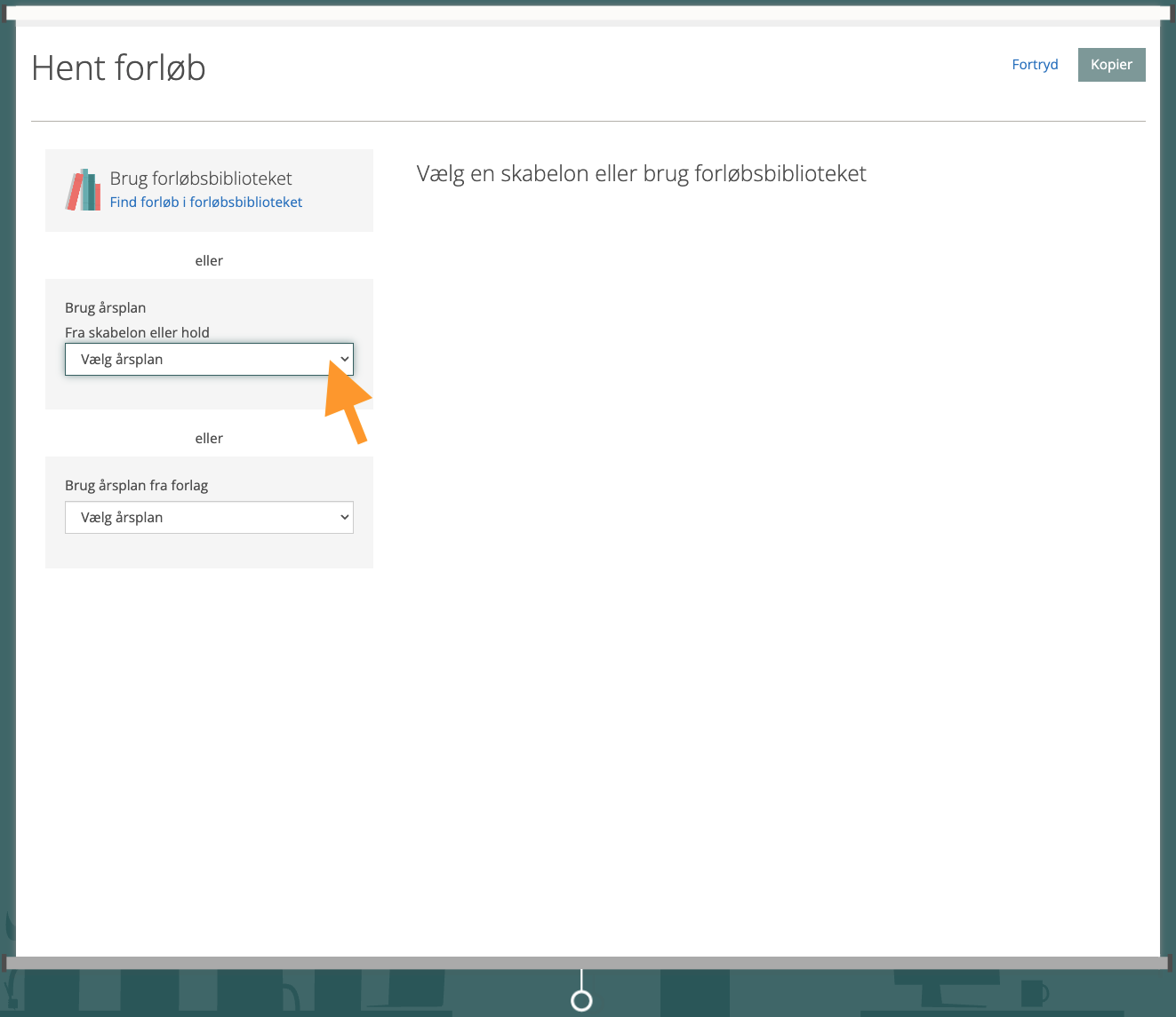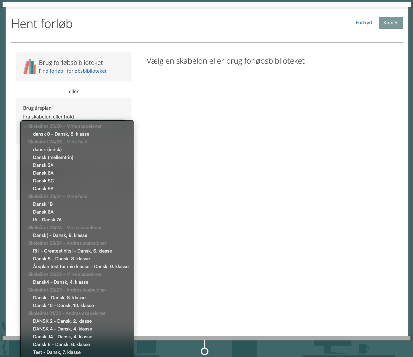 Du har naturligvis også adgang til alle de tidligere årsplaner, du har lavet i MinUddannelse – også hvis du skulle flytte til en anden kommune (der benytter platformen), så ud over dine skabeloner, har du selvfølgelig også adgang til dine tidligere årsplaner, som de endte med at se ud på de respektive klasser, hvor årsplanerne ligger. Også disse kan vælges fra menupunktet “Hent årsplaner –> Fra skabeloner og hold”: